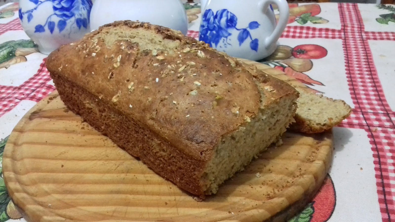 Acrescentar a farinha de aveia e o farelo de aveia, a pitada de sal, o fermento e a chia. Misturar bem com a colher. Pode jogar por cima um pouquinho de granola para enfeite. Colocar em forma retangular para pão em forno médio (180º) por cerca de 30 a 35 minutos.